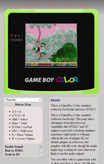 JS GameBoy Color Game Center est un émulateur de Game Boy disponible gratuitement en ligne sur votre navigateur web. De quoi pouvoir rejouer aux jeux qui ont bercé votre enfance.Simple et accessible à tous, JS GameBoy Color Game Center vous accueille avec un écran de Game Boy Color. Nostalgie garantie pour les plus anciens et découverte pour les plus jeunes. En dessous-de l'écran, vous apercevrez une liste déroulante avec des jeux de toutes sortes, de Super Mario Land à Zelda en passant par Donkey Kong Country, Tetris ou Final Fantasy... Vous aurez également un guide avec les commandes du clavier.